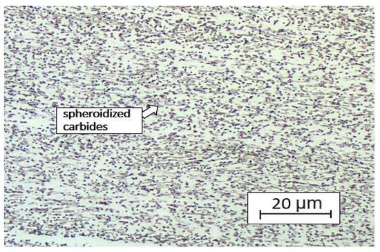 The metallography of the initial states was evaluated after cold rolling and annealing at 680 °C/1 h. The structure consisted of ferritic matrix and spheroidized carbides (Figure 11). The hardness value was 227 ± 7 HV10.
