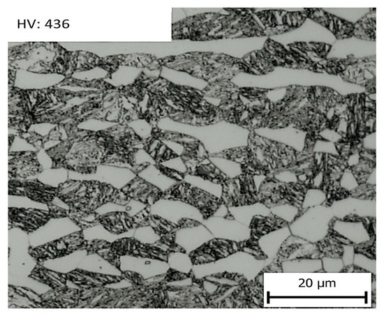 The sample was quenched in the tool for 5 s and was locally heat-treated by induction heating. The sample was locally annealed with a flat coil for 6 s. Subsequent cooling was carried out in the air. The annealing temperature was found to be 925 °C using a thermal imaging camera and a thermocouple (Figure 9). From the induction annealing area, not only was a sample taken for metallographic analysis but also two mini-plates for mechanical testing. The structure at the induction heating site consisted of a mixture of martensite and ferrite with a small amount of residual austenite (Figure 17). Compared to the original state after press hardening, the proportion of ferrite in the structure increased. In terms of mechanical properties, the ultimate strength decreased from 1440 MPa to 1219 MPa (Table 6).