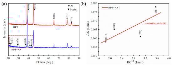 The typical XRD patterns of HPT and naturally aged HPT alloy samples are shown in Figure 2a. It can be seen that the HPT alloy has only α-Al phase diffraction peaks. As for the naturally aged HPT alloy, except for weak diffraction peaks of a MgZn2 phase (η-phase) with a close-packed hexagonal (hcp) structure (the inset of the red framed zone in Figure 2a), other strong diffraction peaks are identified as the face-centered cubic (fcc) crystalline phase of α-Al. The lattice parameter of α-Al in the naturally aged HPT sample is 0.4041 nm, slightly below that of pure Al (0.4050 nm), which is primarily due to the Zn atoms in the α-Al lattice, and the Zn atom has a smaller atomic radius compared with the Al atom. Upon analyzing the XRD patterns, it can be concluded that many of the second phases precipitated in the alloy after natural aging for half a year. Figure 2b shows the line fitting of the XRD result of the naturally aged HPT sample. According to the modified Williamson–Hall equation in related literature [,], the average dislocation density of the alloy is estimated. The equation is listed as follows: