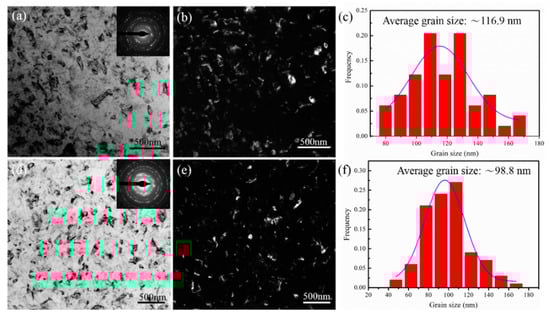 Figure 3a,b show the microstructures of TEM BF and DF images of the HPT alloy sample. Combined with the selected area diffraction pattern (SAED) in Figure 3a, continuous diffraction rings indicate that the Al grains of the alloy are nanoscale, and the average grain size of the HPT alloy is 116.9 ± 0.3 nm, as shown in Figure 3c. Moreover, Figure 3d,e show the microstructures of the naturally aged HPT alloy. The grain sizes of the nanostructured alloy were measured using the TEM DF images using the line interception method. Measuring over 200 grains in 30 TEM DF images, the average grain size value of the naturally aged HPT alloy is 98.8 ± 0.2 nm, and the grain size distribution is presented in Figure 3f. Compared with the HPT alloy, the grain size of the naturally aged alloy is reduced by 15.5%, indicating that recrystallization occurs in the natural aging process.
