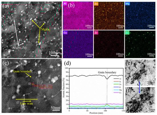 The microstructures of the naturally aged HPT alloy sample at high magnification are shown in Figure 4. Figure 4a,b show the STEM HADDF micrograph and corresponding EDS elemental mapping image. It can be seen that many precipitates existed in the naturally aged HPT sample. According to the EDS elemental mapping, on one hand, the bright white precipitates should be the MgZn2 phase, as denoted by yellow arrows, but a small part of them appears inside the grains and most of them appear at the grain boundaries with an average size of approximately 28 nm. The volume fraction of the MgZn2 phase is 3.4% and the precipitation is primarily along the grain boundaries. On the other hand, the gray spherical precipitates should be the Al3(Sc,Zr) phase, as denoted by white arrows, but primarily appear inside the grains with an average diameter of approximately 20 nm a volume fraction of the Al3(Sc,Zr) phase of 1.9%. At the same time, it can be elucidated that the precipitation of the HPT alloy took place even at room temperature. As can be seen in Figure 4c,d, Figure 4c also shows the STEM HADDF image. The Al3(Sc,Zr) phase can pin the grain boundaries of the alloy, inhibit the movement of the grain boundary, and promote the strength of the alloy. Figure 4d shows an EDS line profile across the grain boundary in Figure 4c, confirming the enrichment of Zn and Mg solute atoms at the grain boundary. After natural aging, the solute atom enrichment of the alloy is appreciable at almost all grain boundaries, and it also shows that the precipitates at grain boundaries may be a MgZn2 phase. Figure 4e,f present the morphological characteristics of dislocations, Figure 4f is an enlarged image of Figure 4e (as indicated by the blue arrow), and the strength of the naturally aged HPT alloy still has the contribution of dislocation strengthening. Compared with the HPT-processed alloy sample, the dislocation density of the naturally aged HPT alloy sample is lower due to dislocation recovery and recrystallization.