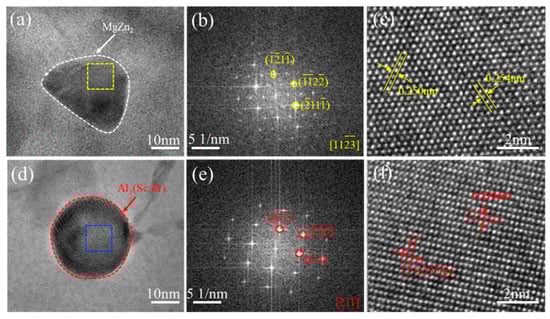 In order to further identify the precipitates accurately, Figure 5 shows the crystal structure of the two precipitates in the naturally aged HPT alloy samples. Figure 5a reveals the typical HRTEM image of the MgZn2 phase. It can be clearly seen that the equilibrium MgZn2 phase has no coherent orientation relationship with the α-Al phase []. The fast Fourier transformation (FFT) pattern (the yellow frame zone in Figure 5a) in Figure 5b shows reflections through the calibration of diffraction spots, indicating the precipitate of MgZn2. At the same time, the lattice fringes of the MgZn2 phase are shown in Figure 5c. The spacing between the two crystal planes of 0.254 nm and 0.250 nm corresponds to and , respectively. In addition, Figure 5d shows the HRTEM image of the Al3(Sc,Zr) phase. It can be found that the Al3(Sc,Zr) phase also has no coherent orientation relationship with the α-Al phase, and it is different from traditional research results indicating lattice bending and disordering as a result of high-pressure torsion. The FFT image (the blue frame zone in Figure 5d) of Figure 5e shows {211} reflections, further confirming the precipitate of Al3(Sc,Zr). Moreover, Figure 5f reveals that the lattice fringes of Al3(Sc,Zr) and the spacing between the two crystal planes of 0.296 nm and 0.235 nm correspond to and , respectively.