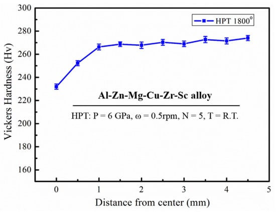 Figure 6 plots the Vickers microhardness against the distance from the disc center for the HPT processed sample, it can be seen that the microhardness of the HPT processing tends to be in a stable stage of 270 HV from the disk center to the edge. Moreover, Figure 7 shows the Vickers microhardness plotted against the distance from the center along eight different radial directions at a load of 1.96 N, they are represented by the letters B-I in Figure 7b, respectively. Combined with Figure 7a,b, the hardness of the naturally aged HPT alloy sample increases with increasing distance to the center and tends toward the saturated value around 265 HV, slightly lower than the hardness of 270 HV after HPT processing (shown in Figure 6). Therefore, it also means that the microstructure of the naturally aged HPT sample is almost homogeneous. The variation of the naturally aged HPT alloy sample hardness results from the combination of nanoscale grains, precipitates, and dislocations.