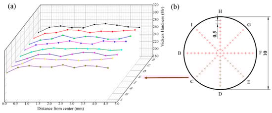 (a) Vickers hardness distributions of eight different radial directions and (b) positions marked for Vickers hardness in a naturally aged HPT disk.
