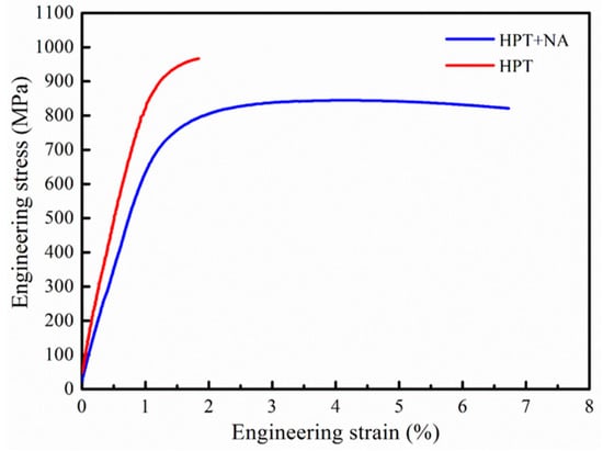 The tensile stress–strain curve of the HPT and HPT + NA alloy samples.