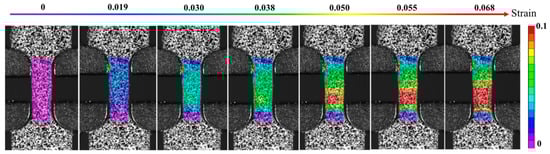Then, the tensile mechanical properties were tested. Figure 8 shows the tensile stress–strain curves of the HPT and naturally aged HPT alloy samples at RT, and the corresponding mechanical property parameters are given in Table 2. The ultimate tensile strength (UTS), yield strength (YS), and elongation (EL) of the HPT alloy sample are 966 ± 5 MPa, 924 ± 3 MPa, and 1.8 ± 0.1%, respectively. It can be seen that the mechanical properties of the HPT-processed alloy are similar to those of previous literature [,,] and belong to high strength and low elongation, while the HPT alloy is a brittle fracture. Moreover, the ultimate tensile strength, yield strength, and elongation of the naturally aged HPT alloy sample are 851 ± 6 MPa, 796 ± 5 MPa, and 6.8 ± 0.2%, respectively. Therefore, a nanostructured Al-Zn-Mg-Cu-Zr-Sc alloy with high strength and reasonable ductility is obtained by HPT followed by natural aging, and the naturally aged HPT alloy sample may be a ductile fracture, which will be discussed in the fracture characteristics section. Additionally, the local von Mises strain distributions of the naturally aged HPT sample at various tensile strains are presented in Figure 9. It was analyzed by the digital image correlation method [] using the displacement of the observation points, and the relevant digital images before and after the deformation of the sample were calculated according to the pre-defined correlation function to obtain the tensile deformation information of the sample. At the tensile strain of 0, the localized strain value was approximately 0, presenting a uniform state. As the tensile strain increased, strain localization became more and more evident. When the tensile strain of the alloy was 0.05, the localized strain reached a high value of 0.1. Under these conditions, the neck contraction worsened, and the localized strain of the tensile sample maintained a constant of nearly 0.1 until the tensile sample fracture and the tensile strain of 0.068. In other words, the DIC technique was used to describe the process of the tensile sample.