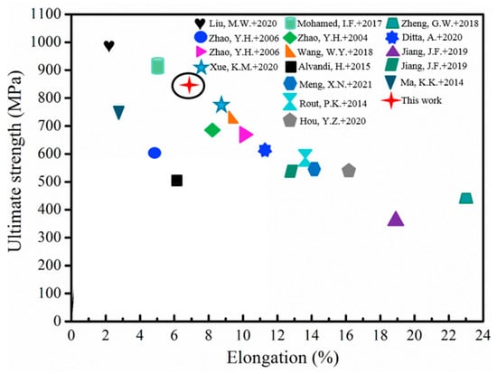 Summary of the tensile properties of high-strength Al alloys from the literature [,,,,,,,,,,,,,] and the present work.