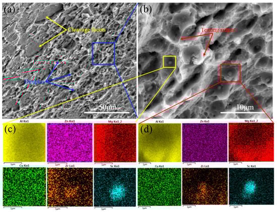 In order to study the tensile fracture mechanisms of the naturally aged HPT sample, fracture surface morphologies were observed by SEM, as shown in Figure 11. As can be seen from Figure 11a, many dimples with an average size of 3 μm and cleavage facets are discovered, and the former morphology is dominant, indicating that the alloy belongs to a ductile and brittle mixed fracture, but it is primarily a ductile fracture. Figure 11b is the enlarged blue rectangle area in Figure 11a, and it can be found that the sizes of the dimples are not uneven and we observed tearing ridges around the dimples. The formation of the alloy dimples is centered on the second phase. Due to the existence of part of the second phases, these second phases may become the center of the dimples, so the size of the alloy’s dimples is not uneven in the fracture morphology of the alloys. Moreover, Figure 11c,d show the elemental mapping images of the yellow and red rectangle areas in Figure 11b, respectively. It can be elucidated that the second phases in the center of the dimples are Al3(Sc,Zr) particles and there may be some large phases left over from the previous solution treatment without remelting.