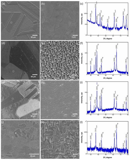 Figure 1 shows the SEM micrographs and XRD patterns of samples 13, 30, 39 and 40, electrodeposited on Ag polycrystalline substrates. All the low-magnification SEM micrographs shown in Figure 1a,d,g,j reveal a clear grain-based contrast. In other words, the film deposited on each substrate grain has a specific brightness, indicating that the morphology of the deposited film is affected strongly by the orientation of the substrate grain. This orientation-dependent contrast proves that the films are likely deposited epitaxially [30,37]. Moreover, the SEM micrographs at high magnifications (Figure 1b,e,h,k) acquired from the squared area in the corresponding low-magnification micrographs show that the films are composed of crystals oriented in the same manner, confirming the hypothesis of epitaxy. Accordingly, most of the films were deposited epitaxially on their underlying substrate grains. The epilayer deposited on a specific substrate grain hereinafter is thus called a domain. It is known that the Cu2O crystals have either {111} or {100} habit planes depending on the depositing conditions. In the present case, the SEM micrographs in Figure 1e,k, for samples 30 and 40, respectively, show that the crystals are encapsulated by {100} planes. In Figure 1b,h, no clear habit planes can be identified. With the assistance of the crystals grown on other areas (results not shown), the crystals in samples 13 and 39 have {111} habit planes. In addition, the XRD diffraction patterns acquired in an θ-2θ configuration for these samples are shown in Figure 1c,f,i,l, respectively, to reveal the coherent length, strain and preferred orientation of the deposited films. The intensity ratios among peaks of Cu2O should be roughly the same as those of Ag if the films were all grown epitaxially based on a cube-on-cube orientation relationship (OR). However, it is worth mentioning that at least four more ORs were identified between Cu2O and Ag in addition to the expected cube-on-cube OR [30]. Therefore, the intensities of the Cu2O peaks vary from one sample to another. The grain orientation is expressed as an <hkl>//ND notation; here, ND represents the normal direction of the sample surface. A measure of the relative amounts of the <hkl>//ND texture component was obtained from the peak intensities according to Formula (1) as proposed in [38]: