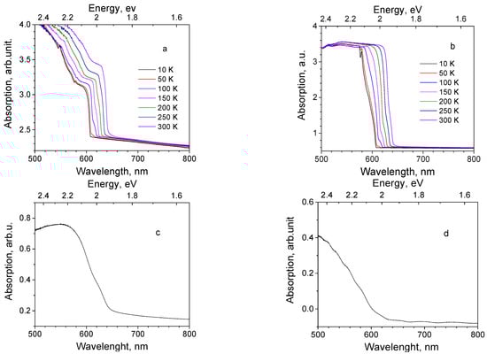 Absorption spectra of single crystals (100) and (111) obtained in the present work (Figure 3a,b) clearly show the thermal shift of the band edge by 0.13 eV in the 10–300 K range and signs of lines from the yellow exciton series at the lower temperature. The optical band gap values obtained for both crystals from the Tauc plot constitutes 2.04 eV at 10 K, which is lower than most of the literature data.