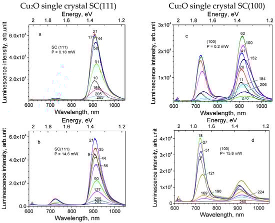 In general, the experimental spectra of Cu2O single crystals, containing emission bands consisting of an exciton (609 nm; 2.04 eV), a doubly charged oxygen vacancy (720 nm; 1.72 eV), an oxygen vacancy (812 nm; 1.53 eV), and an electrically neutral copper vacancy (910 nm; 1.36 eV) (see Figure 4a–d) coincide well with the photoluminescence spectrum in the 600–1050 nm spectral range reported previously [42,43]. The mentioned energies are observed at low temperature (10 K), and the emission energies decrease due to the band gap narrowing with increasing temperature. Already in the 1980s and later, it was suggested that the emission bands of Cu2O natural and synthetic crystals in the 700–1000 nm range are connected with bound excitons localized at oxygen and copper vacancies [6,26,51]. The varied mutual relation is observed between intensities of the emission bands in samples SC(100) and SC(111), as seen in Figure 4a,b, which becomes even more pronounced under increased excitation power (Figure 4c,d). The different relative contributions of the defect-related emission bands to the PL spectrum in samples SC(100) and SC(111) cut from the same crystal rod, should be explained rather by the inhomogeneous distribution of the intrinsic defects along the crystal rod created during growth, than by the crystallographic plane of the sample surface.