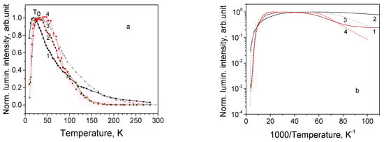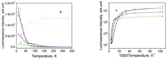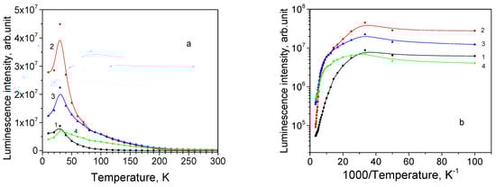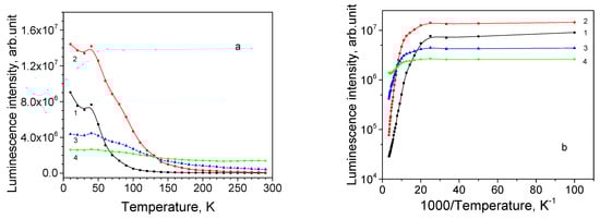 In the present paper, the temperature dependence and the corresponding Arrhenius plot are shown graphically for the most intensive 720 and 910 nm bands of sample SC(111), see Figure 5a,b. For the 910 nm band, T0 shifts from 20 K under the higher excitation power (Figure 5a, curve 1) to 50 K under the lower excitation power (Figure 5a, curve 3), whereas for the 720 nm band, T0 varies from 35 to 55 K (Figure 5a, curves 2 and 4). At higher temperature, the corresponding curves drift together. Similar luminescence behavior is observed in sample SC(100).