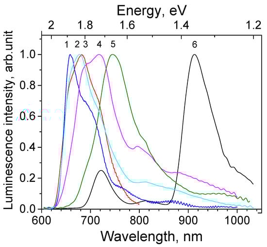 Normalized photoluminescence spectra of Cu2O samples under excitation with 532 nm laser at 10 K: thin films 1—30, 2—40, 3—13, 4—39, 5—111, and 6—crystalline sample SC(100).