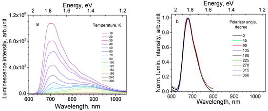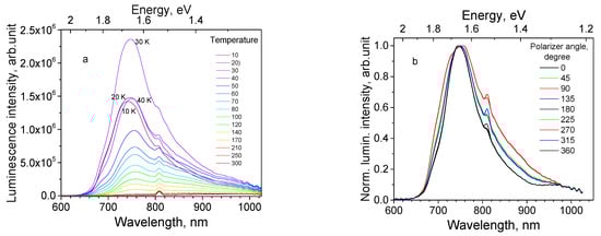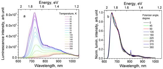 Polarized luminescence for this sample was measured only in the 600–800 nm spectral range (Figure 9b) because of the insufficient emission intensity at higher wavelengths. Faint signs of polarized luminescence are seen as the irregular thickening of the spectrum overlapping curve.