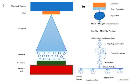 In chemical methods, precursor compounds are used, usually salts of some metallic element, and it is desired that these precursors react chemically on the substrate to be coated []. On the other hand, in physical methods, the material to be deposited is initially in powder form and, when some type of energy is applied to it, whether mechanical, electrochemical, or thermodynamic, the material is removed from the target and is then deposited on the substrate []. It is worth mentioning that physical methods require the use of low pressures through vacuum generation to ensure proper deposition and are therefore more expensive compared to chemical methods []. By contrast, chemical bath and ultrasonic spray–pyrolysis are the simplest and cheapest chemical techniques, due to their simplicity [,]. Ultrasonic spray–pyrolysis is an easy process to handle. It can be used to deposit over large areas, in addition to the fact that the deposit temperature is very low. It can be utilized for deposits on flexible materials; in this process, it is possible to use a wide variety of precursors, and the cost of this process is inexpensive compared to other techniques. Additionally, it does not include the control of high-pressure processes. This process has the capability of growing multilayer structures and can have the freedom to calibrate deposition variables such as deposition temperature, deposition substrate, precursor composition and concentration, and solvent composition. Pyrolysis (from the Greek pyro (fire) and lysis (break)) is one of the types of reaction that is induced to obtain the deposit of a certain desired material. The energy to carry out the reaction is provided by the increase in temperature; therefore, the word thermolysis is an equally applicable term. As its etymology suggests, applying heat to the precursor material to break its chemical bonds results in the formation of a new compound [,].