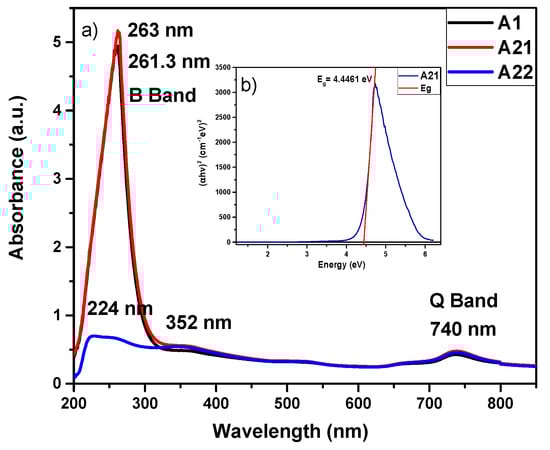 Figure 2a shows the UV-Vis spectrum of the MnPcs films. As can be seen, the absorbance spectra of the samples A1 and A21 are stronger than that of the A22 film; additionally, they exhibit the characteristic B band around 261, 263, and 224 nm. A large decrease in the strength of the B-band absorption peak of the A22 sample located around 224 nm can be observed, which is due to the orbital overlap of the phthalocyanine ring and the central metal ion [,]. On the other hand, the three samples exhibit the Q band, which lies at 740 nm and shows a weak intensity for the three films [,]. Another band is presented at 352 nm, which is a characteristic band of the MnPc. It is known that the ultraviolet-visible (UV-vis) absorption spectra of metallic phthalocyanines are the result of their widely conjugated π electrons and the overlapping orbitals of the central metal ion. The B-band is associated with the central metal arising from the π-d [] transitions.