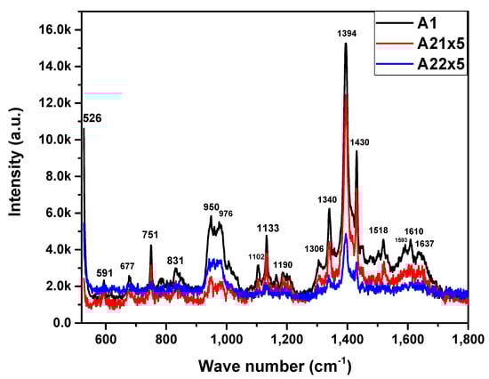 Raman spectra of MnPc films for samples A1, A21, and A22.