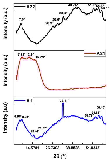 The X-Ray diffraction patterns of the MnPc films are shown in Figure 4. The diffractograms exhibit the characteristic diffraction peaks for the monoclinic phase of the MnPc films; this characteristic phase is confirmed by both the crystallographic cards and the reports found in the literature [,,,,,,,]. The monoclinic phase is found in the vast majority of metallic phthalocyanines where it is considered a dominant phase [,]. All diffraction peaks present the same phase, as listed in Table 2. An outstanding characteristic observed in the diffraction patterns is that the peaks are broad and tend to exhibit an amorphous behavior. The annealing process applied to the MnPc films modified the diffraction peaks as it is observed in the XRD diffraction patterns. The films A1 and A22 show a great majority of diffraction peaks compared to film A21; this is due to the temperature effects where the molecules seek their chemical stability.