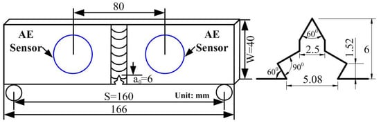 The testing material investigated in the present work was A7N01 aluminum alloy, which is widely used in the manufacture of high-speed train body structures. The aluminum alloy samples were welded using tungsten-electrode inert gas (TIG) welding. Single-edge notched bending (SENB) fatigue specimens of the A7N01 aluminum alloy base metal and weld (WSENB) were prepared according to the ASTM E647 standard. The geometric dimensions of the specimens and notches are illustrated in Figure 1. The notch end faces of the samples were polished with sandpaper to capture the damage images of the notch tip during the fatigue damage AE monitoring experiment.