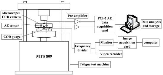 Fatigue damage tests were performed on an MTS809 (MTS Systems, USA) fatigue test machine, and the test device is exhibited in Figure 2. The fatigue loading frequency of all samples was 4 Hz, and the crack length was measured using a COD gauge. The fatigue tests included whole process fatigue tests and fatigue crack propagation tests. The fatigue test parameters are listed in Table 1. In the fatigue crack propagation test, a crack of 10 mm was prefabricated using the K-decreasing method.