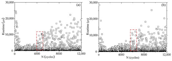 Variation diagrams of the AE rise time in the fatigue crack initiation process of A7N01 aluminum alloy: (a) the base metal; and (b) the weld.