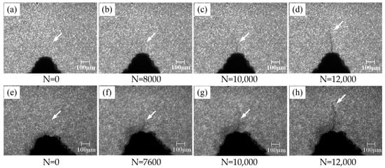 Figure 4 demonstrates the initiation and evolution of notch tip microcracks in the fatigue damage process of the A7N01 aluminum alloy base metal and weld seams. Figure 4a,b shows the initial state of the polished notch tips on the base metal and weld seam samples before fatigue loading. Under fatigue cycle stress, microcracks were found at the notch tip of the base metal after 8000 fatigue cycles (Figure 4b), and the length of the microcracks was about 87 μm. With an increase in the number of cycles, the microcrack at the notch tip of the base metal continued to propagate, and its length reached 273 μm when the number of cycles was 12,000. Compared to the evolution of the microcrack at the notch tip of the base metal, the microcrack at the notch tip of the weld seam occurred after 7600 fatigue cycles, and its length was about 127 μm. With an increase in the number of cycles, the microcrack in the weld seam continued to propagate, and its length reached 377 μm when the number of cycles was 12,000.