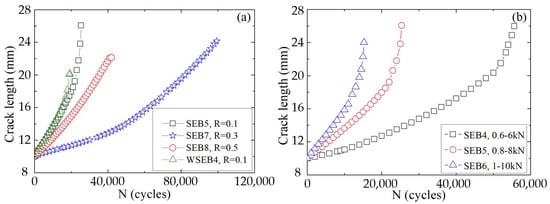 Figure 5 shows the variations in the crack lengths during fatigue damage of the A7N01 aluminum alloy under different stress ratios and load ranges. As can be observed, the crack propagation rate of the base metal was higher under lower stress ratios and higher peak loads, as seen in Figure 5a. In addition, under the same stress ratio, the crack propagation rate of the weld seam was higher than that of the base material, as shown in Figure 5b. This is because the impurities generated in the welding process may become the core and path of the fatigue crack nucleation and propagation, respectively.