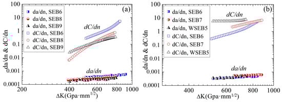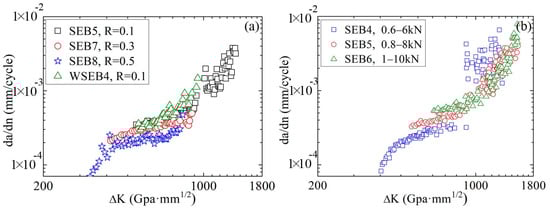 Figure 6 presents the relationships between the crack propagation rate and stress intensity factor of the A7N01 aluminum alloy base metal and weld seam under different stress ratios and peak loads. As it can be observed, under different stress ratios and peak loads, the fatigue crack propagation of the base metal and weld seam during the stable crack propagation stage followed the Paris rule. At the same ∆K, the crack propagation rate of the base metal increased with a decreasing stress ratio and increasing peak load.