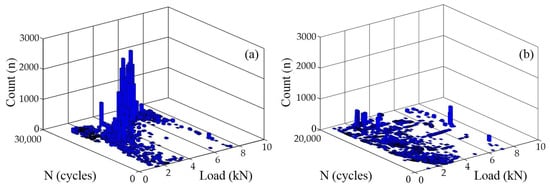 Figure 7 exhibits the three-dimensional bar charts of the AE count as a function of the fatigue load and cycle period in the fatigue damage process of the A7N01 aluminum alloy base metal and weld seam when the peak load was 8 kN and the stress ratio was 0.1. The values of the AE characteristic parameters in the three-dimensional bar charts represent the degree of activity of the AE signals under different stress states during fatigue cycles. According to Figure 5, most of the AE signals in the steady fatigue crack propagation stage were generated in the low-stress stage of the cyclic loading. This is mainly because the AE activities in the low-stress stage are mainly related to the plastic deformation and crack closure phenomenon of the crack tips. Subsequently, in the third fatigue crack propagation stage, the generation of AE signals began to shift toward the high-stress stage of cyclic loading.