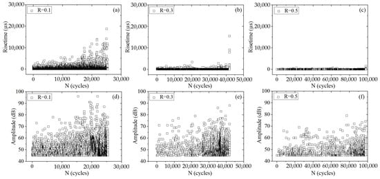 Figure 8 presents the AE rise time and amplitude of the base material and weld seam under different fatigue stress ratios. It can be observed that, when the peak load was 8 kN and the stress ratio was 0.1, the AE rise time and amplitude during the stable crack propagation stage were in the ranges of 0–5689 μs and 45–82 dB, respectively. Whereas during the unstable crack propagation stage, they were in the ranges of 0–18,767 μs and 45–96 dB, respectively. When the stress ratio was 0.3, the AE rise time and amplitude during the stable crack propagation stage were in the ranges of 0–3381 μs and 45–79 dB, respectively, while during the unstable crack propagation stage, they were in the ranges of 0–15,482 μs and 45–88 dB, respectively. When the stress ratio was 0.5, both the AE rise time and amplitude decreased; during the stable crack propagation stage, they were in the ranges of 0–669 μs and 45–69 dB, respectively, and during the unstable crack propagation stage, they were in the ranges of 0–1490 μs and 45–79 dB, respectively. Therefore, with an increase in stress ratio, the AE rise time and amplitude tended to decrease.