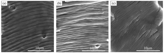 Figure 11 shows SEM images of the fatigue fracture of the A7N01 aluminum alloy base metal under different stress ratios. It can be observed that under different fatigue stresses, the lower the stress ratio, the higher the fatigue crack propagation rate in the base material, as shown in Figure 5a. In each fatigue cycle, the large extension distance of the crack propagation manifested as an increase in the fatigue striation spacing of the fracture. This may be the main reason why the AE characteristic value of the base metal decreased with increasing stress ratio.