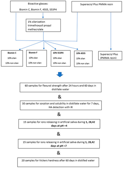 Samples of acrylic resin polymerized hot curing method by the addition of bioactive glasses (totally 104 samples) were used for the tests. The same resin for making denture base (totally 30th sample) polymerized according to the manufacturer’s recommendations was used as a reference sample. A detailed description of the sample’s preparation is given below, and all performed tests are summarized in Figure 1.