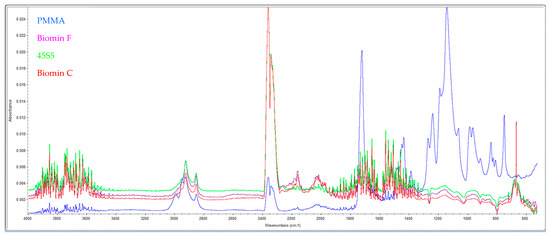 Pure acrylic resin samples and samples containing bioactive glasses, which were used for solubility and solubility tests, were subsequently used for surface testing using an IR spectrophotometer. The samples were placed on the window of this instrument, Nicolet I5S (Thermoscientific, Prague, Czech Republic) and measured in the IR range of 4000–500 cm−1. For each of the 5 sample groups, 3 measurements were made.