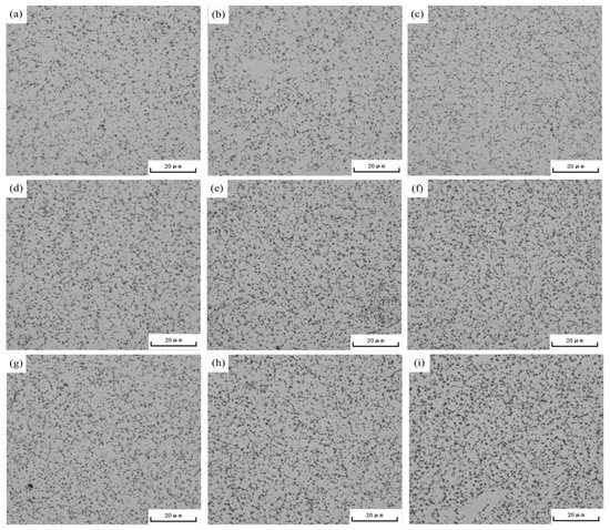 In the context of this study, aging temperatures of 165 °C, 180 °C, and 195 °C were chosen, with aging times of 1 h, 3 h, and 5 h. A schematic diagram of the metallographic structure is presented in Figure 3. Figure 3a–c illustrates the metallographic structures aged at 165 °C. From these images, it can be discerned that the count of secondary phase particles precipitated at grain boundaries augments with the aging time, albeit the growth rate does not show a significant rise. Figure 3d–f depicts the metallographic structures aged at 180 °C for 1 h, 3 h, and 5 h. It is evident that with increasing aging time, the secondary phase particles grow significantly from 1 h to 3 h. After 3 h of aging time, there is no substantial increase in particle quantity, and the growth rate slows down, accompanied by some degree of coarsening. Figure 3g–i displays the metallographic structures aged at 195 °C. It can be seen that when the aging time is 1 h, a certain number of secondary phase particles have already precipitated in the alloy. As time extends, the particles in the alloy’s metallographic structure do not continue to increase, but exhibit some degree of coarsening.