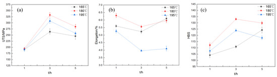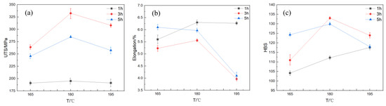 Tensile tests were conducted on the AlSi10MnMg die-cast specimens following aging. Tensile strength versus aging time curves were obtained for specimens aged at 165 °C, 180 °C, and 195 °C. Figure 4a illustrates the variations in tensile strength, elongation, and Brinell hardness values with aging time for specimens aged at 165 °C, 180 °C, and 195 °C, with holding times ranging from 1 to 5 h. As shown in the figure, with an increase in holding time, the tensile strength of specimens aged at 165 °C initially rises, reaches a peak of 263.8 MPa after 3 h of aging time, and then declines with a further increase in aging time. The minimum value of the curve is obtained at 1 h, with a tensile strength of 190.9 MPa. The tensile strength curve of specimens aged at 180 °C initially increases with a growing holding time, reaching a maximum value of 332.5 MPa at 3 h of aging time, and then decreases with a further increase in aging time. When the holding time is 5 h, the tensile strength drops to 284.6 MPa. The curve of specimens aged at 195 °C demonstrates that the tensile strength remains relatively stable with increasing aging time, with only slight fluctuations, and ultimately declines slightly at the holding time of 5 h. The maximum value of the tensile strength curve is observed at 3 h of aging time, with a value of 308.0 MPa. The minimum value is observed at the holding time of 5 h, with a tensile strength of 257.4 MPa, resulting in a varied range of approximately 50 MPa.