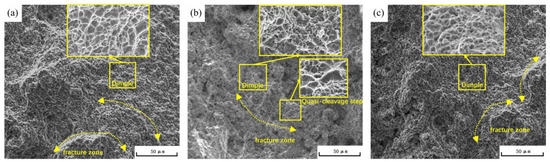 Tensile fracture surfaces SEM images of AlSi10MnMg longitudinal carrier at (a) 165 °C × 3 h; (b) 180 °C × 3 h; (c) 195 °C × 3 h.