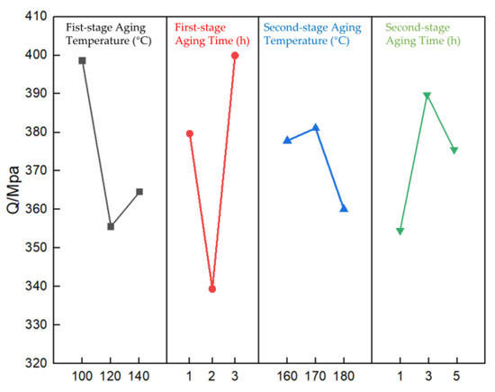 Range analysis elucidates that the influence of the different factors on the Q value of the AlSi10MnMg die-casting alloy’s room-temperature tensile test is as follows: B > A > D > C. This suggests that in employing double-stage aging heat treatment for the die-cast AlSi10MnMg alloy, the degree of influence of process parameters on the alloy’s mechanical properties is in the order of first-stage aging time > first-stage aging temperature > second-stage aging time > second-stage aging temperature.