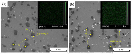 Based on the range analysis of the orthogonal experiment, the double-stage aging process that achieved the optimal tensile strength for the die-cast AlSi10MnMg alloy is as follows: a first-stage aging temperature of 100 °C, a first-stage aging time of 3 h, a second-stage aging temperature of 180 °C, and a second-stage aging time of 3 h. By comparing the microstructure of the AlSi10MnMg alloy after single-stage aging (Figure 8a) and double-stage aging (Figure 8b), after double-stage aging, the precipitated phases in the alloy are more compact and uniformly distributed. The scanning electron microscopy (SEM) images and Mg element surface scanning results in Figure 9 indicate that the AlSi10MnMg longitudinal carrier, after two-stage aging treatment, has more precipitation phases that contain Mg, and the Si particles are smaller and more dispersed.