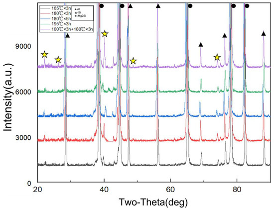 From the XRD analysis in Figure 10, it can be observed that the Mg2Si phase precipitates in all of the aged AlSi10MnMg alloys, but the sharpness and area of the Mg2Si peaks differ. After 3 h of aging at 165 °C, the Mg2Si peak is relatively flat and lower, indicating that a large number of G.P. zones have precipitated, resulting in lower strength values after aging. After 3 h of aging at 195 °C × 3 h and 180 °C × 5 h, the Mg2Si XRD peak is the sharpest, indicating that a significant amount of stable β-Mg2Si has precipitated, which is considered as overaging. At 180 °C × 3 h aging, the Mg2Si XRD peak sharpness is moderate, which means that the Mg2Si in the AlSi10MnMg alloy has not completely transformed into the stable β phase, and a large amount of Mg2Si transitional phase exists in the alloy, resulting in higher mechanical strength values. Furthermore, the comparison of Mg2Si peak areas shows that at 165 °C for 3 h of aging, the Mg2Si peak area is 2553.15, while at 180 °C for 3 h, 180 °C for 5 h, and 195 °C for 3 h of aging, the Mg2Si peak area is around 3000.50, which are 2858.45, 3104.45, and 3044.60, respectively. This suggests that the content of the precipitated Mg2Si phase is similar under these conditions.