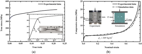 Measured quasi-static stress in terms of the strain responses of component materials: (a) uniaxial tensile stress–strain curve for the AA6061-T6 aluminum sheet, (b) uniaxial compressive stress–strain curve for the aluminum foam (experimental data was obtained from ref. [42], whereas the simulation data was obtained from compression of the Voronoi foam model constructed in Section 3).