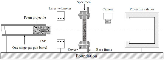 The experimental setup is shown in Figure 4. The sandwich specimen was fastened to the base frame with M8 bolts, which left a square area with an edge length of 100 mm exposed in the center. The combined loading was generated via the high-velocity impact of the composite projectile. A single-stage gas gun, with a barrel diameter of 57 mm, was used to accelerate the composite projectile. The impact velocity and residual velocity of the FSP were measured by a laser velometer and a high-speed video camera, respectively.