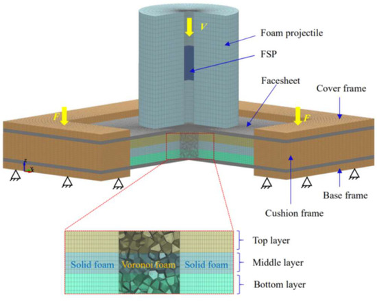 No bonding was employed between the facesheet and the core, which was consistent with the specimen. A tied node to surface contact was employed between the boundary of the Voronoi foam core and the inner boundary of the surrounding solid foam core. An automatic surface to surface contact was set for all possible surface to surface contacts (the friction value of 0.2 was employed) including: (i) contact between each of the two foam core layers, (ii) contact between the core and the surrounding cushion frame, (iii) contact between the cushion frame and facesheet, (iv) contact between the facesheet and base/cover frame, and (v) contact between the facesheet and foam core. An automatic single contact was employed to avoid self-penetration of the cell walls of the Voronoi foam core. The base frame was fixed by means of constraint at each bolt hole region, whereas a force was exerted on each bolt hole region in the cover frame to sandwich the specimen. In the simulation, the composite projectile impacted the sandwich panel with an initial velocity. Between the sandwich panel and composite projectile, an automatic node-to-surface contact was employed. It should be noted that the failure between the facesheet and foam core could not be considered, based on the present model.