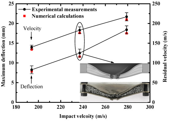 To provide a benchmark to the numerical approach, three sandwich panels with uniform density cores (0.369 g/cm3) were subjected to composite projectiles () of different impact velocities. The measured incident velocities of the three sandwich panels were 193 m/s, 237 m/s and 279 m/s, respectively. The peak deflection of the back facesheet and the residual velocity of the FSP are two key criteria in the anti-blast design and the anti-perforation design of sandwich panels [14,32]. Therefore, these two criteria were selected to validate the effectiveness of the numerical model. The residual velocities of the FSP and maximum central deflections of the back facesheet obtained from experimental measurements and numerical calculations are compared in Figure 6. The errors of the experimental measured residual velocities were , , and , respectively, due to oblique shooting by the high-speed camera. Whereas the errors of the measured maximum central deflections of the back facesheet were , i.e., half the thickness of the back facesheet. It was shown that the simulations agreed well with the measurements for both residual velocity and deflection. Therefore, the above numerical model was considered effective to simulate perforation and deflection behaviors of the sandwich panel when subjected to combined loading.