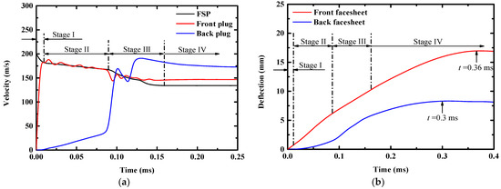To illustrate the structural response of the sandwich panel under combined loading, the deflection-time histories of the facesheets and velocity–time histories of the FSP are presented in Figure 8a,b, respectively. According to Figure 8a, the perforation process of the FSP could be divided into four stages. In stage I, the front facesheet was perforated in plugging mode, a plug (front plug) was ejected and attained the same velocity as the FSP. In stage II, the foam core was penetrated by the FSP and the plug ahead. In stage III, the back facesheet was extruded by the densified foam core ahead of the ejected plug and FSP until penetrating the back facesheet, and a plug (back plug) was also ejected from the back facesheet. In stage IV, the FSP left the sandwich panel. The deflection of the front facesheet induced by the foam projectile (blast loading) lasted during the entire response process, as seen in Figure 8b. The front facesheet started to deflect as the foam projectile interacted with it (), meanwhile the front facesheet attained velocity and started to compact the foam core. An elastic precursor wave was first formed in the foam core and propagated to the back facesheet, and, thus, the back facesheet deflected gradually (stage II). With continued compaction of the foam core, a shock wave formed in the foam core and propagated to the back facesheet. The back facesheet was then clearly deflected (stage III). After the deflection of the back facesheet achieved a critical value, the deflection rate of the back facesheet slowed until reaching the maximum deflection. The back facesheet reached its maximum deflection at , while the front facesheet reached its maximum deflection at . During this regime (), the foam core was further compacted to a larger densification strain by the front facesheet, as analyzed above.