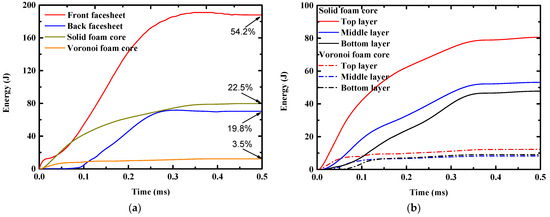 Figure 9b compares the energy absorbed by each layer of the foam core. The top foam layer absorbed more energy than the other foam layers, whereas the bottom foam layer absorbed the least energy, although the thickness and density of each foam layer was the same. According to the cross-sectional profile of the sandwich panel in Figure 7, the top foam layer was compacted to a larger extent than the other foam layer, and, therefore, the top layer absorbed more energy. It was also shown that the solid foam core absorbed more energy than the Voronoi foam core. Considering that the solid core underwent only compression, whereas the Voronoi core underwent combined compression and perforation, it was inferred that the foam core absorbed most energy in a compression manner.