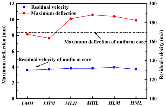 According to Figure 13, the time delay had an obvious influence on both the residual velocity of the FSP and the maximum deflection of the back facesheet. The sandwich panel exhibited superior blast resistance (smaller maximum deflection of back facesheet) under combined loading of than under combined loading of and for most core configurations. As for the perforation resistance (residual velocity of the FSP) of the sandwich panel, the sandwich panel exhibited superior perforation resistance (smaller residual velocity of the FSP) under combined loading of . The difference in perforation resistance for each sandwich panel could have been due to a deforming effect [52]. The FSP was penetrating a deforming sandwich panel (induced by blast loading), and, as the deforming extent was determined by the time delay, different time delays would result in different perforation resistances of the sandwich panels. It was shown that the deforming extent of the sandwich panel under combined loading of achieved a superior perforation resistance ability. Although the blast resistance and perforation resistance were sensitive to time delay, the perforation resistance of the sandwich panel was not sensitive to core configuration for all the considered combined loadings. The optimal gradient of core configuration, in terms of blast resistance, was still LHM.
