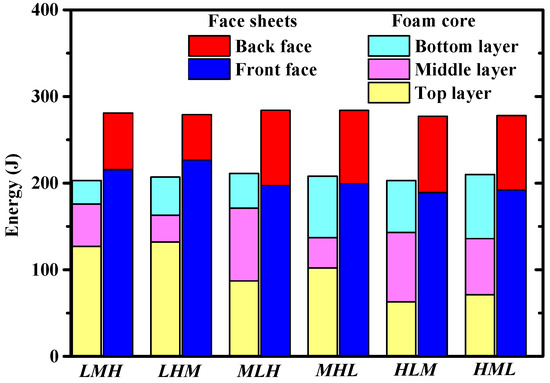 The energy absorbed by each component of the sandwich panels having different core layer arrangements can be observed in Figure 11. It was shown that the total energy absorbed by the facesheets was nearly the same, but the ratios of energy absorbed by the front facesheet and the back facesheet were different for different foam core configurations. The energy absorbed by the back facesheet of LHM was the smallest among the considered core configurations, which was consistent with the trend of the maximum deflection of the back facesheet, shown in Figure 10. Placing low density foam (L) at the top core layer led to more energy being absorbed by the top core layer, whereas placing the high-density foam (H) at the top layer led to less energy being absorbed by the top foam layer. This feature was also applicable for the bottom layer and the middle layer. Therefore, placing low density foam at the top layer was beneficial in enhancing the blast resistance of the sandwich panel. Actually, placing low density foam at the top layer would facilitate the compaction of the foam core, as seen in Figure 12, which further facilitated the deflection of the front facesheet, as more kinetic energy of the combined loading was absorbed by the front facesheet, so the deflection of the back facesheet reduced. Comparison between LMH and LHM indicated that placing high-density foam at the middle layer provided stronger support to the top layer, and the top layer would be compacted to a larger densification strain. As a result, the front facesheet of LHM had a larger deflection and the back facesheet of LHM had a smaller deflection.