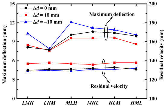 The above analysis indicated that a sandwich panel with a core configuration of LHM exhibited the best blast resistance, i.e., minimum deflection of the back facesheet. However, whether this conclusion was applicable for different combined loadings was not known. It has been reported that time delay between blast loading and fragment impact loading is one of the most important characteristics of combined loading [42,44]. Therefore, sandwich panels with different core configurations and with three different time delays, i.e., (blast loading acts before fragment impact loading), and (fragment impact loading acts before blast loading), were subjected to combined loading. The peak deflection of the back facesheet and the residual velocity of the FSP for various core configurations under combined loading and with different time delays () are illustrated in Figure 13.