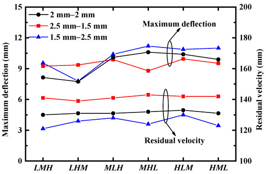 In the above sections, all of the sandwich panels considered had symmetrical facesheets. In practical applications, asymmetrical facesheets are generally applied to achieve better performance [9,11]. Therefore, whether asymmetrical facesheets would affect the optimal gradient of the core configuration was explored. Three pairs of asymmetrical facesheets were considered, in which a total thickness of 4 mm was employed ( in Figure 14 denotes that the front and back facesheets were x mm and y mm, respectively). The performances (both deflection and residual velocity) of sandwich panels with different core configurations and different asymmetrical facesheet pairs are illustrated in Figure 14.