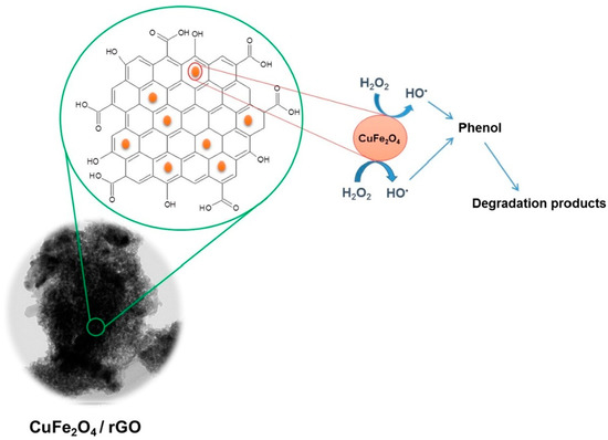 - Othman, I.; Abu Haija, M.; Ismail, I.; Zain, J.H.; Banat, F. Preparation and catalytic performance of CuFe2O4 nanoparticles supported on reduced graphene oxide (CuFe2O4/rGO) for phenol degradation. Mater. Chem. Phys. 2019, 238, 121931. [Google Scholar] [CrossRef]